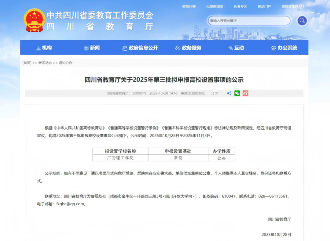 10月28日,四川省教育厅发布《关于2025年第三批拟申报高校设置事项的公示》。公示显示,拟新设广安理工学院,办学性质为公办。