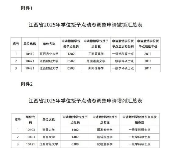 近日,江西省教育厅发布《关于2025年江西省学位授予点动态调整撤销和增列的公示》。根据《国务院学位委员会关于修订印发〈博士、硕士学位授权学科和专业学位授权类别动态调整办法〉的通知》(学位〔2020〕29号)精神,江西省组织开展了2025年博士硕士学位授权学科和专业学位授权类别动态调整工作。现拟对江西省2025年动态调整撤销和增列学位授予点名单予以公示。