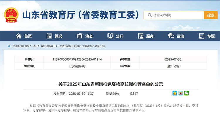 7月30日,山东省教育厅发布《关于2025年山东省新增推免资格高校拟推荐名单的公示》,拟推荐齐鲁工业大学、山东第一医科大学、青岛农业大学为新增推免资格高校,公示期为2025年7月30日至8月3日。
